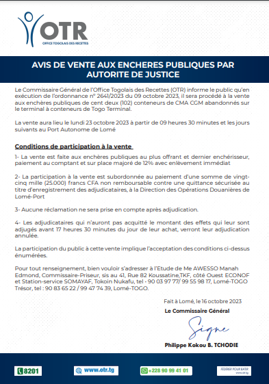 Le Commissaire Général de l’Office Togolais des Recettes (OTR) informe le public qu’en exécution de l’ordonnance nº 2641/2023 du 09 octobre 2023, il sera procédé à la vente aux enchères publiques de cent deux (102) conteneurs de CMA CGM abandonnés sur le terminal à conteneurs de Togo Terminal. La vente aura lieu le lundi 23 octobre 2023 à partir de 09 heures 30 minutes et les jours suivants au Port Autonome de Lomé Conditions de participation à la vente.