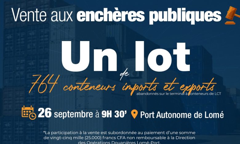 Le Commissaire Général de l’Office Togolais des Recettes (OTR) informe le public qu’en exécution de l’ordonnance N°2403/2023 du 07 septembre 2023, il sera procédé à la vente aux enchères publiques de sept cent soixante-quatre (764) conteneurs imports et exports abandonnés sur le terminal à conteneurs de Lomé Container Terminal (LCT).