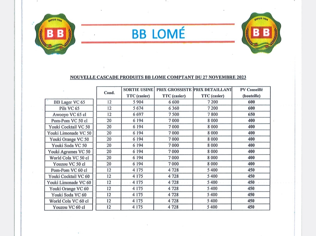 La Brasserie du Bénin (BB) Lomé a annoncé un réajustement des prix de ses boissons (bières et sucreries) à partir du lundi 27 novembre 2023. Dans une note aux partenaires et clients, le directeur général, Thierry FERAUD avance des raisons liées aux taxations fiscales et à la flambée des coûts des matières premières.