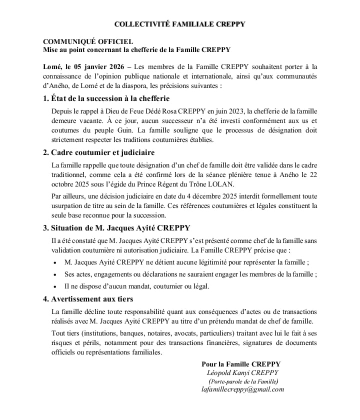 La Famille Creppy a publié, le 5 janvier 2026 à Lomé, un communiqué officiel pour clarifier la situation liée à sa chefferie, restée vacante depuis le décès de Dédé Rosa CREPPY en juin 2023.